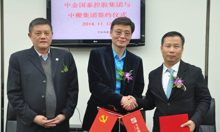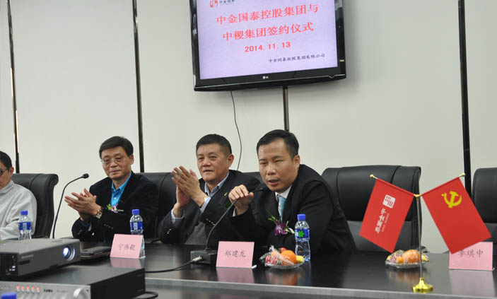 2014年11月13日,中稷集团董事长宁伟毅先生和副总经理范琳祥先生一行8人莅临位于陆家嘴国金中心二期48楼中金国泰集团总部并与中金国泰控股集团签署合作协议。集团董事长兼总裁郑建龙先生携集团高层出席签约仪式。