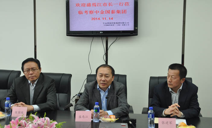 2014年11月14日,新疆石河子市市长、党委副书记、农八师师长盛焉江同志携副师长孙雷、副市长侯国俊及市商务局、援疆办、经委、信息办等单位领导参观并考察了中金国泰控股集团。中金国泰集团总裁郑建龙先生率集团高管接见了考察团。